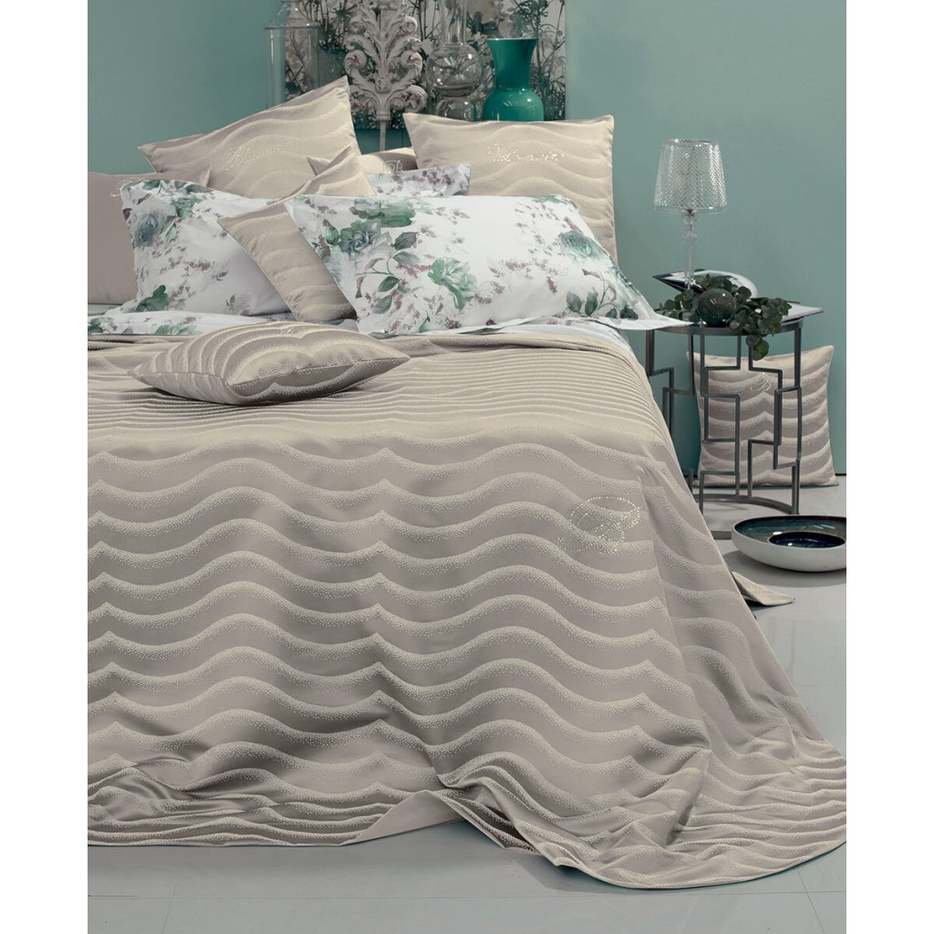 Prešívaná prikrývka Blumarine Jasmine vyniká elegantným žakárovým vzorom s vlnovým efektom a ikonickým logom z krištáľov Swarovski®. Talianska elegancia, jemný lesk a komfort, ktorý obklopí vašu spálňu luxusom.