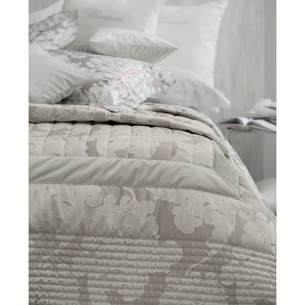 Prehoz Blumarine Gemma je majstrovským dielom talianskeho dizajnu – v sebe spája noblesu žakárového tkania a jemný pôvab velúrových detailov. Starostlivo vytvorené velúrové pásy lemujú hornú plochu aj tri bočné strany prehozu, čím vytvárajú luxusný rám, ktorý dodáva posteli dokonalý tvar a eleganciu.
