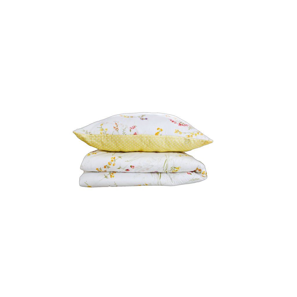 Jemné lúčne kvety — ružová, oranžová, fialová, žltá, zelená — sú rozptýlené po bielom plátne s prirodzenou nepravidelnosťou, ako keby ich niekto práve nechal dopadnúť z dlane. Nie sú uložené do vzoru. Nekopírujú sa mechanicky. Každý pohľad na posteľ odhalí niečo iné.
