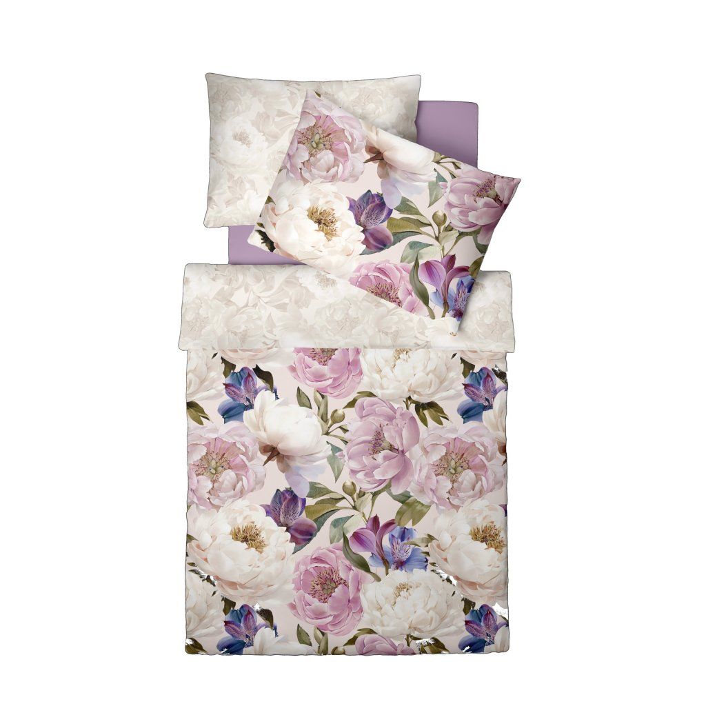Sú kvety, ktoré nepotrebujú vysvetlenie. Pivónia je jednou z nich. Veľká, nežná, plná — a keď rozkvitne, celá miestnosť to vie. Séria FLOWER ART 5055-4 od fleuresse® zachytáva pivónie v ich najkrajšom momente: biele, ružové, fialové, doplnené modrými kvetmi alstroemerie a zeleným listom. Digitálna tlač na krémovo-ružovom Mako-Satin podklade s fotografickou presnosťou. Zadná strana jednofarebná levanduľová. OEKO-TEX® certifikovaná.