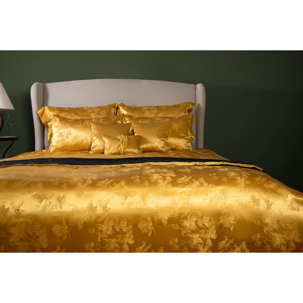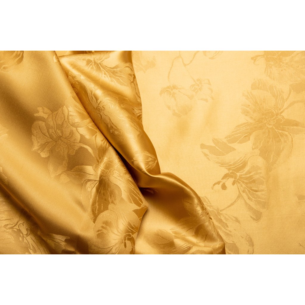 Ada je luxusná kolekcia hodvábnych obliečok zo 100 % prírodného hodvábu, ktorá zaujme svojím sýtym zlatým odtieňom a elegantným kvetinovým žakárovým vzorom. Jemný lesk a hebkosť hodvábu prinášajú výnimočný komfort počas spánku, zatiaľ čo prirodzené termoregulačné vlastnosti zabezpečujú ideálnu teplotu po celý rok. Ada je dokonalou voľbou pre tých, ktorí hľadajú spojenie elegancie, luxusu a kvalitného spánku.